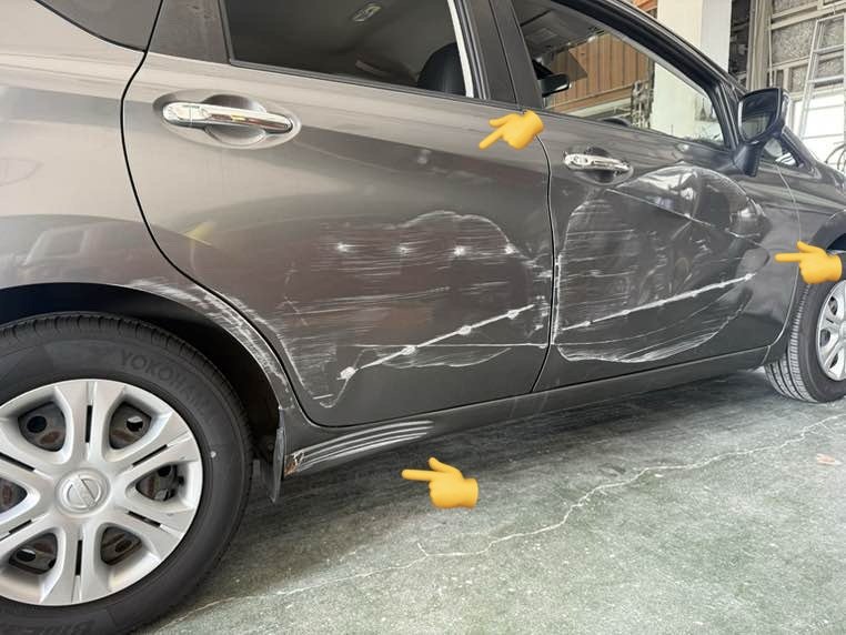 右フロントドア、右リヤドア、右ロッカーパネルが広範囲で大きなヘコミ、右クオータパネルも20cmくらいのヘコミがあり、リヤバンパー右側にスリキズがありました。