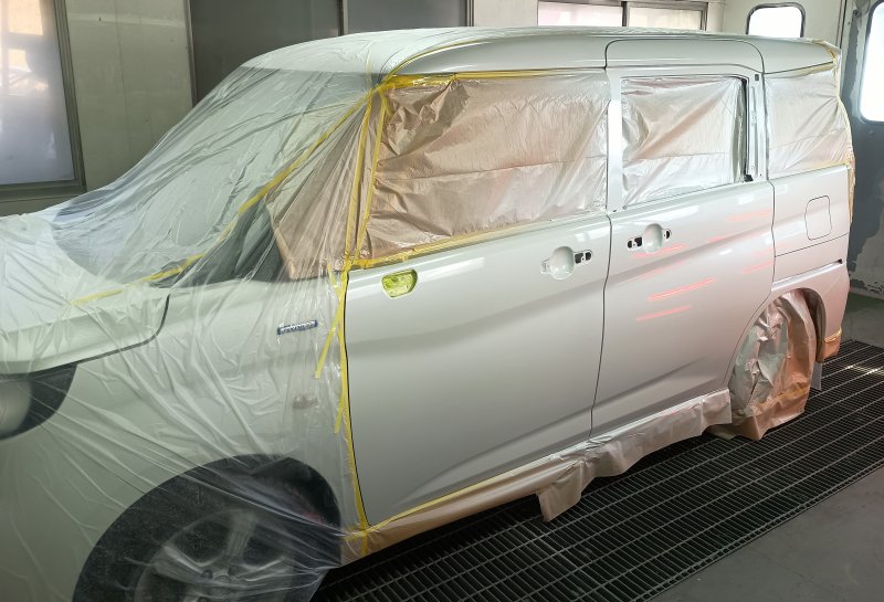 新品のスライドドアは内側を先に塗装して乾かしたら車体に組み付けて塗装の準備をします。