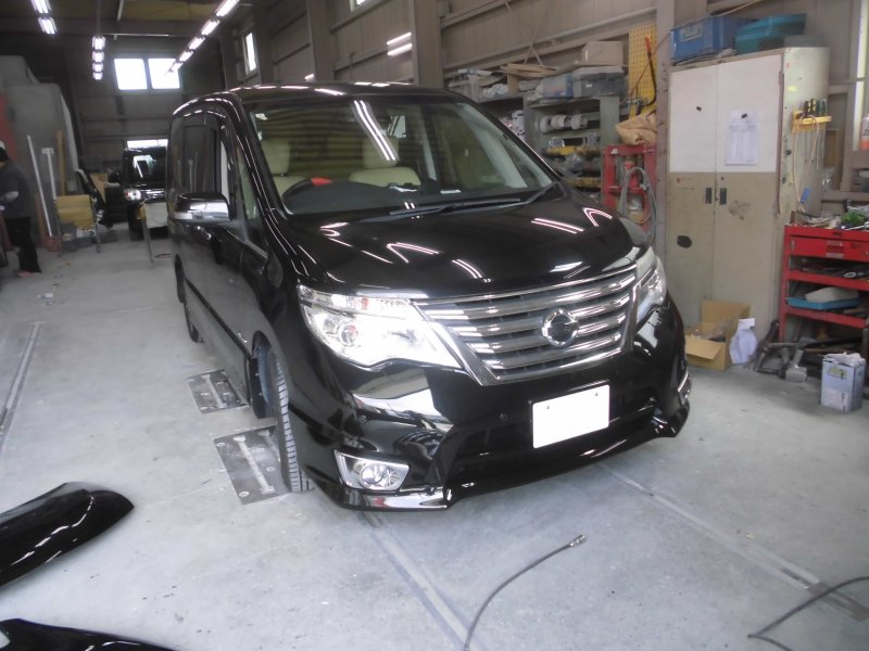 神奈川県座間市|セレナ(日産)のキズ・へこみ直し事例(フロントバンパー交換 右ライト交換 右フェンダー交換 フード交換)