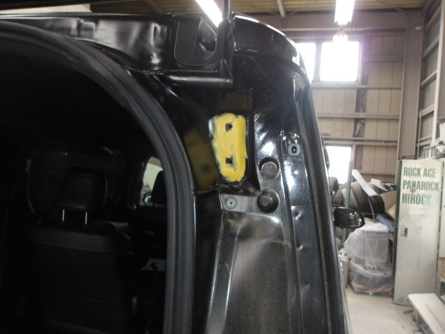 リヤゲートの左右のダンパーの取り付け部分です。左右どちらも凹んでいる為、新しいダンパーが付くように鈑金致しました。