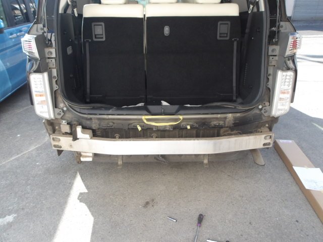 神奈川県座間市|エルグランド(日産)のキズ・へこみ直し事例(リヤバンパー交換 バックパネル鈑金)