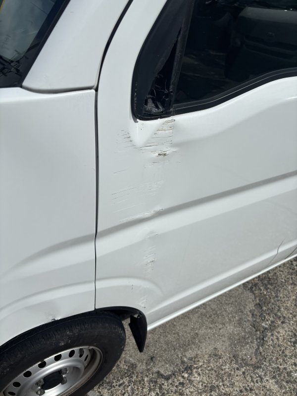 スズキ エブリーにお乗りのお客様よりフロントドア付近をブロックに当ててしまい傷やヘコミができた為、直しの問い合わせで来店頂きました。