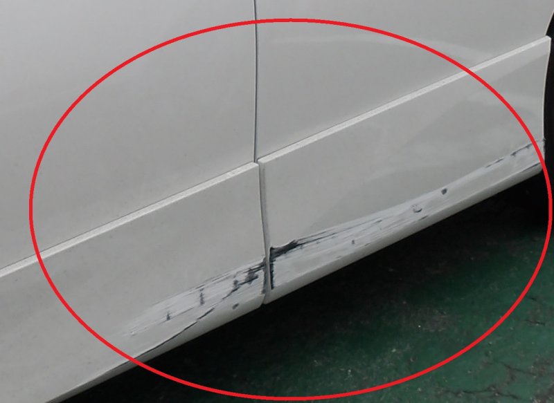 お車を確認させて頂くと、左前ドアと左後ろスライドドアのプロテクター付近にキズへこみがついていました。また、中のドア部分もへこんでいました。