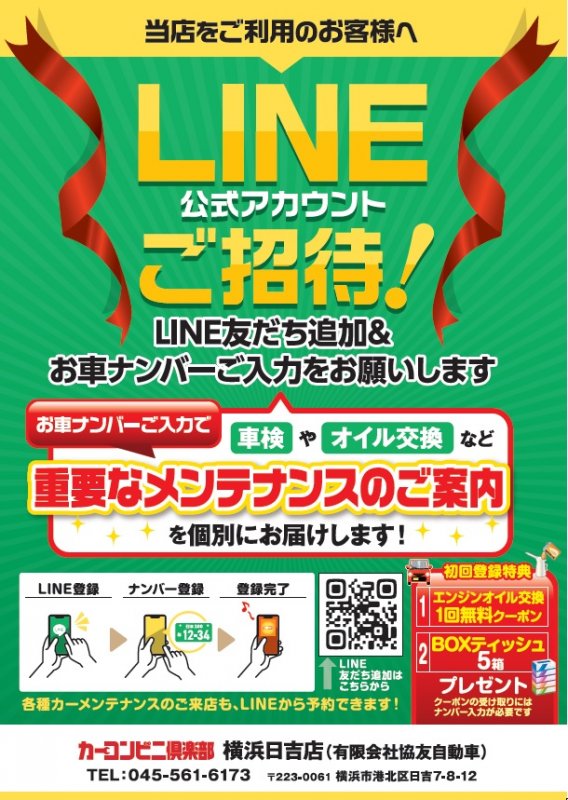 この度はカーコンビニ俱楽部横浜日吉店(協友自動車)店をご利用いただきましてありがとうございました。