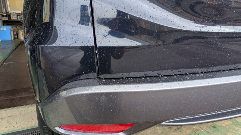 板金作業:リアゲートとリアバンパーのへこみ部分を専用の工具で慎重に引き出し、元の滑らかなボディラインを復元しました。
