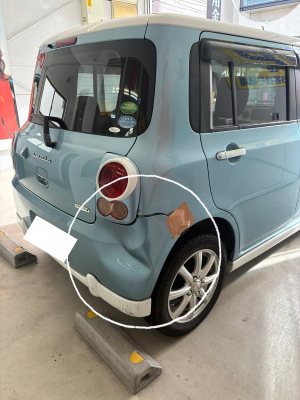 今回はスズキラパンのリアバンパーからフェンダーにかけてのキズへこみの修理をさせていただきました。