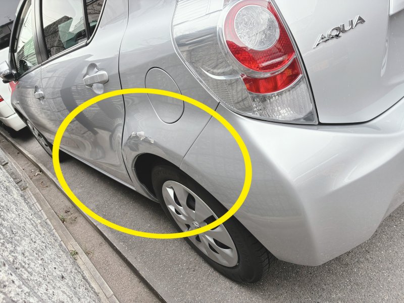 今回はトヨタアクアのリアドアからリアフェンダーにかけての傷とへこみを鈑金修理をさせていただきました。