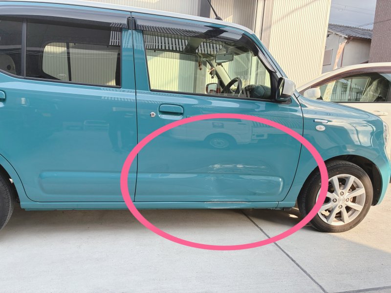 今回はマツダキャロルの右フロントドアからロッカーパネルにかけてのキズ・へこみを保険を使って修理させていだだきました。