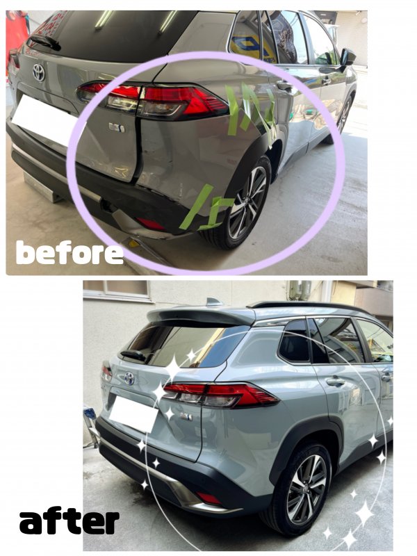 トヨタ カローラクロス バックドア リアバンパー 右リアフェンダー リアドア 鈑金 塗装 修理 京都市 山科区