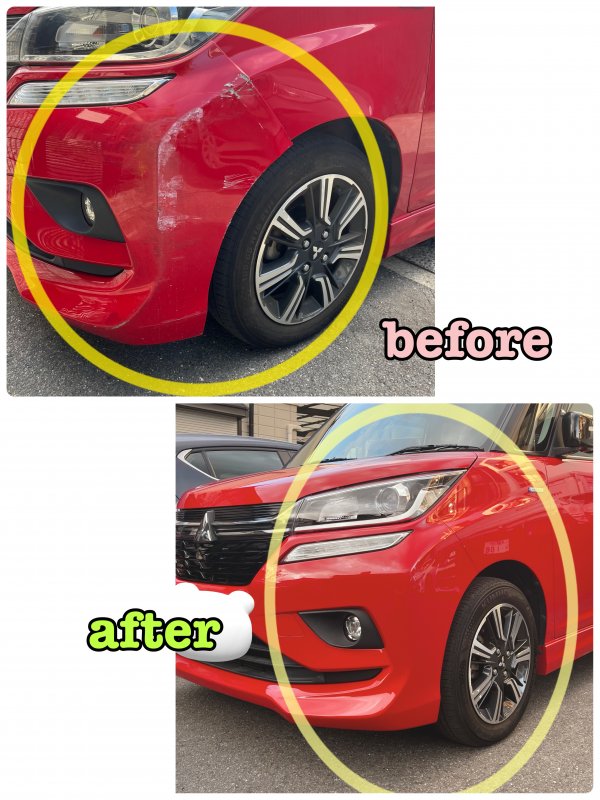 左フロントバンパーからリアバンパーにかけての傷ヘコミの修理