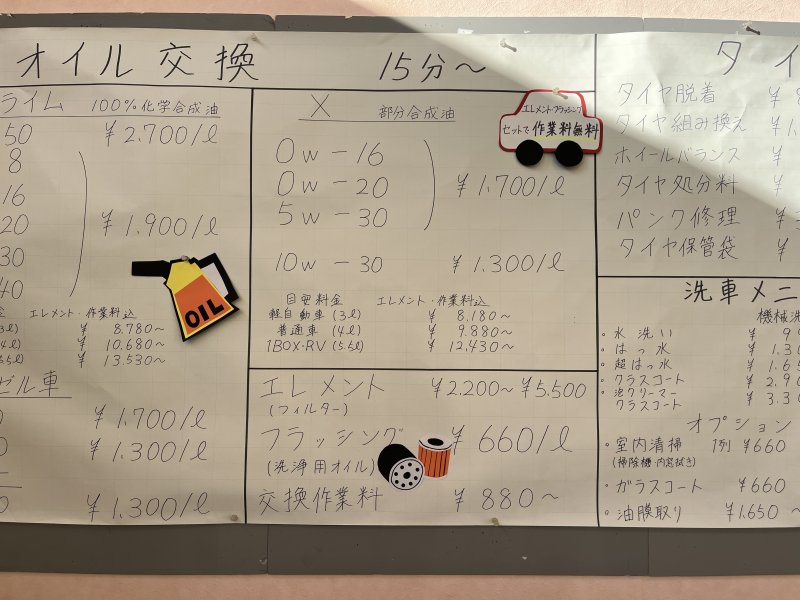 当店ではガソリン給油の他にも車検やオイル交換・タイヤ交換・洗車などのあらゆる車のメンテナンスもさせて頂いております。