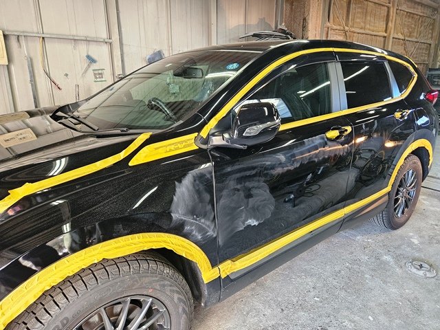 本日の車輛は、前回フロントバンパーの修理でご利用いただきましたお客様より修理依頼で入庫しましたホンダCR-Vになります。前回に続き当店のご利用誠にありがとう御座います。左側面を枯れ枝・枯草に擦ってしまってキズが付いてしまったとの事でした。幸い爪が引っかかる程のキズでは無い為、キズ落としの磨きと磨きで落ちてしまうコーティングの再施工の内容でご提案をし作業を進めました。状態によって違いは有りますが、今回の様に塗り直しをしなくても済むキズの場合もありますので、ご愛車の気になるキズ等お気軽にご相談下さい。