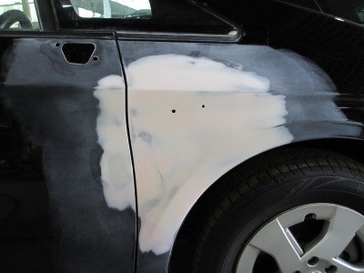 損傷部分の塗膜を削り、専用の器具を使ってヘコミを引き出していきます。ヘコミを9割程引き出したらパテという粘土状の物を塗ります。