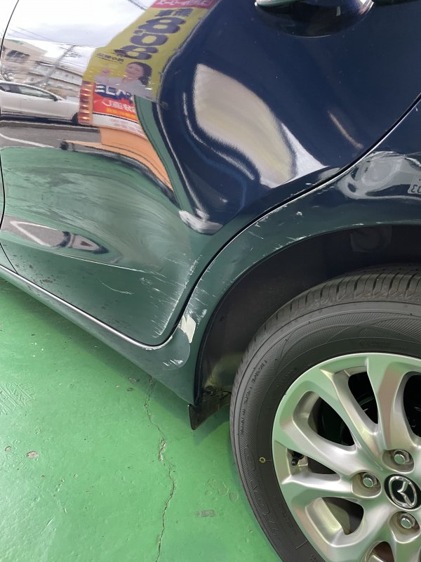 堺市 西区 マツダ デミオ 左リヤサイド 傷 凹み 損傷 車の修理 自動車 事故 保険