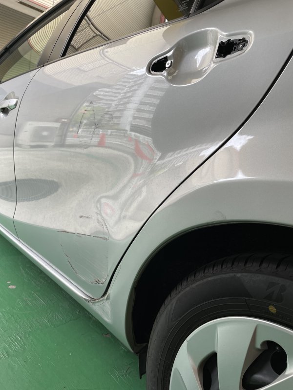 堺市 西区 トヨタ アクア 左リヤサイド損傷 キズ へこみ 鈑金 塗装 車修理 親切 丁寧 安心
