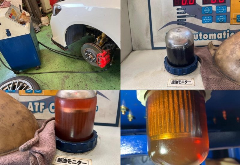 交換後の状態です。トルコン太郎内のフィルターを使い、更に洗浄した後、添加剤を注入し、フルード量を調整します。