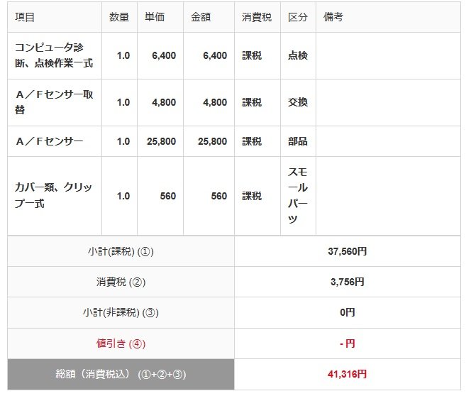 | 修理の箇所・サービス内容 | エンジンチェックランプ点灯 |