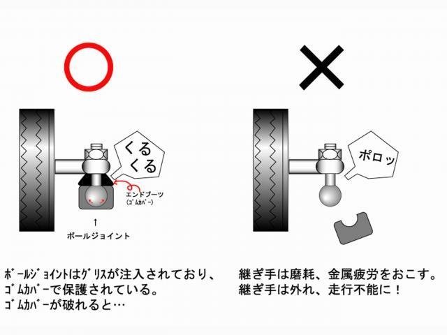 ボールジョイントについて。ブーツが破れ、ベアリングの摩耗が進むと大事になってしまうので、早めの交換が必要です。