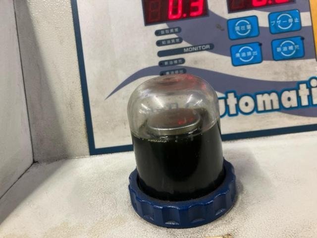 交換前のCVTフルード。黒く濁り、劣化が進んでいました。