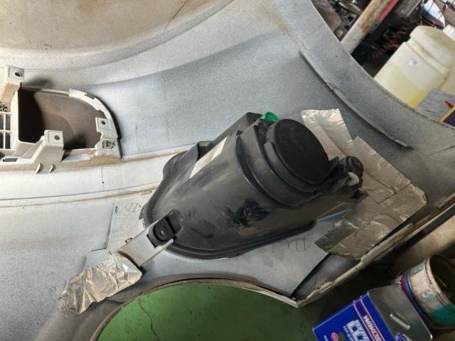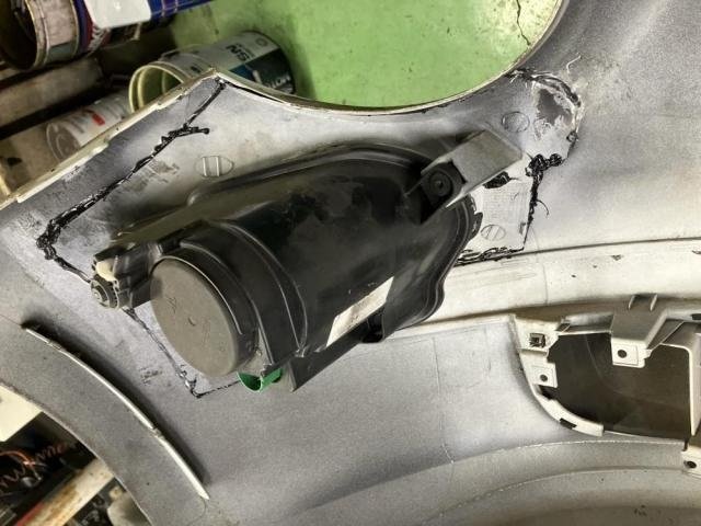 ハイビーム側のヘッドライトステーが剥がれており、フロントバンパーを外すとアルミテープで補修されていました。しかしテープが剥がれ、再度ガタついている状態でした。今回はエポキシ樹脂でしっかり固定補修しました。