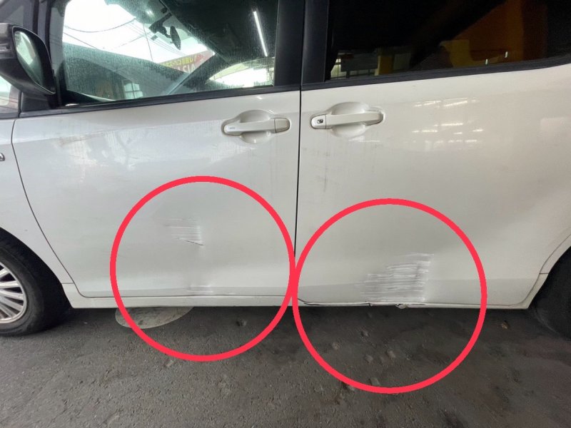 左フロントドアと、左リヤドアからサイドステップにかけて、大きなへこみがありました。
