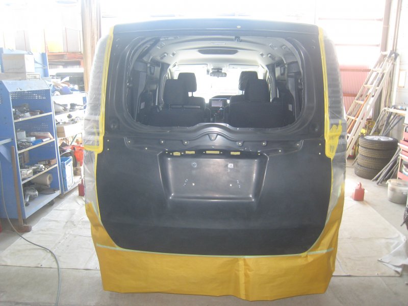 新しい部品に塗装をしてエンブレムやナンバー、取り外したガラスを取り付けます。