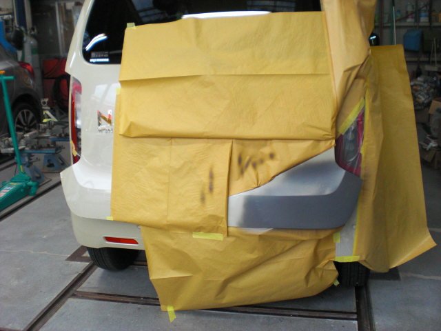 【長野県 上田市 塩田町 中野 東御市 上田菅平】スズキ スペーシア、平成29年12月式、DAA-MK53S、リヤバンパー、左クオーターパネルキズ・ヘコミ修理事例、最安値、最短修理日数、安心安全