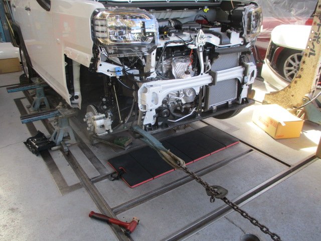 【長野県 上田市 塩田町 中野 東御市 上田菅平】ダイハツ・タフト、令和4年7月式、6BA-LA910S、フロント廻り破損修正、フロントバンパー交換、骨格修正修理事例、最安値、最短修理日数、安心安全
