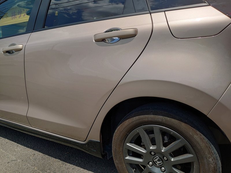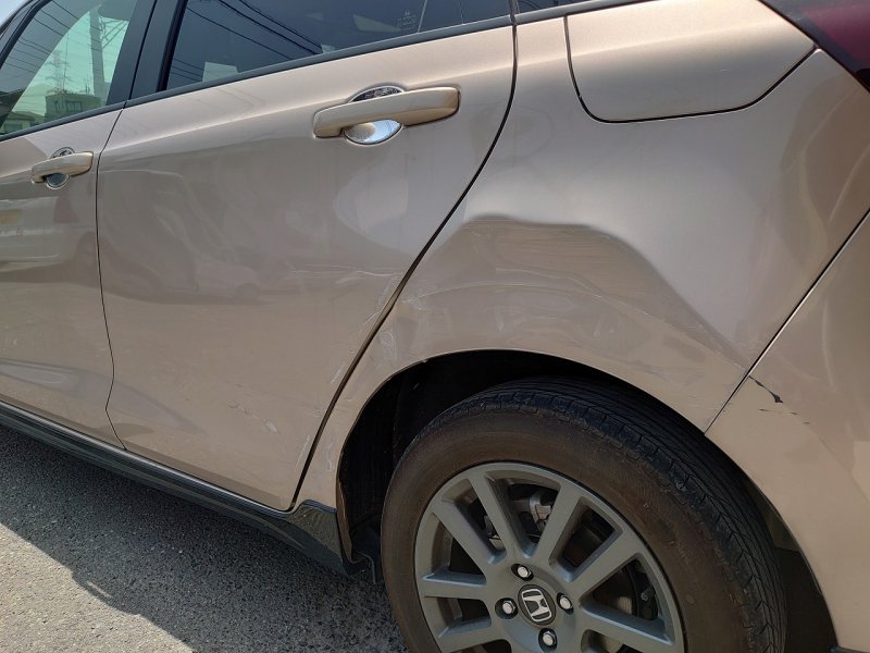 左リヤ後方側面のリヤドアからリヤバンパーまでの損傷です。