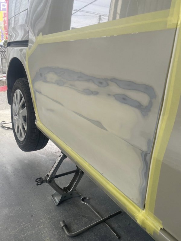 損傷はリアドア単体に見えましたが、ボディカラーや仕上がりの美しさを重視し、フロントドアまでぼかし塗装を行う修理プランをご提案しました。