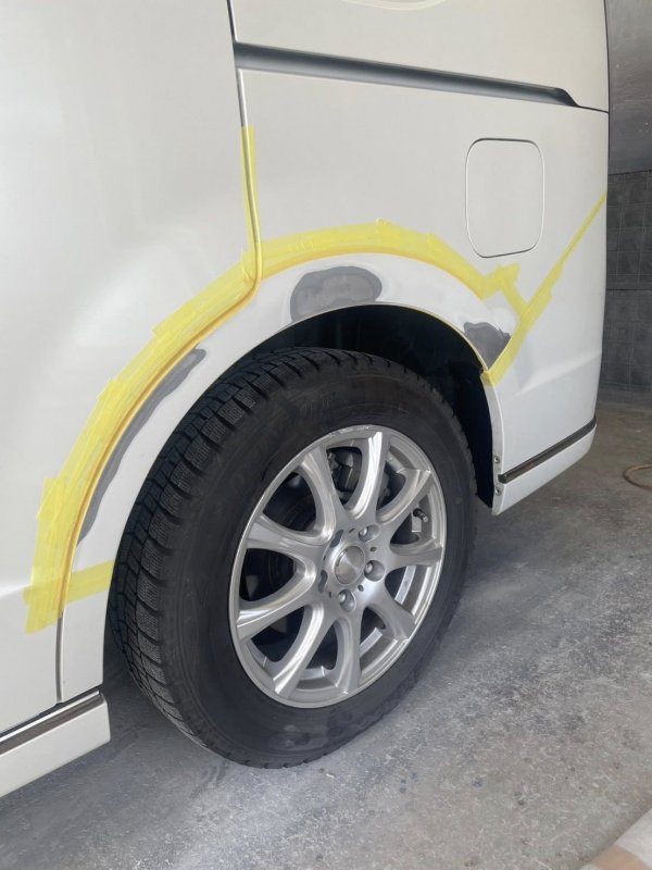 リアフェンダーは車体の一部と一体になっているパネルのため、交換ではなく鈑金修理での対応を行います。