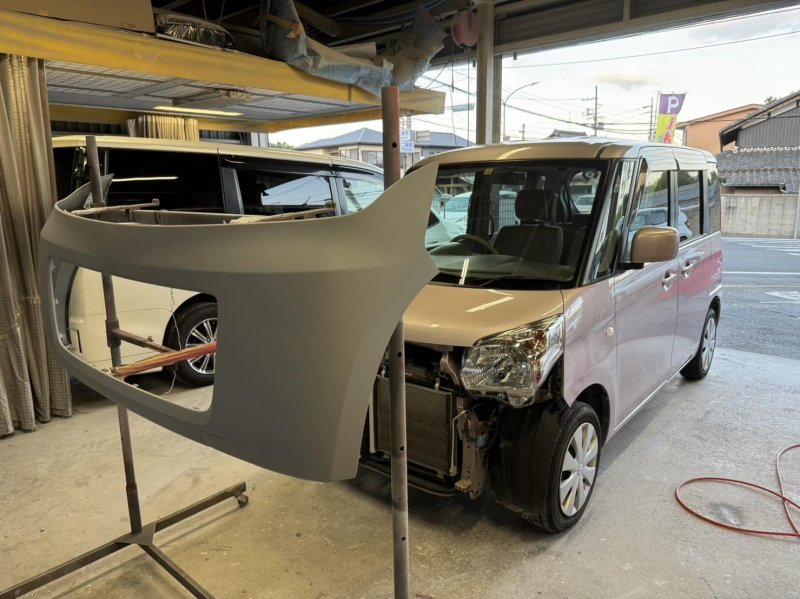奈良県 奈良市 スズキ スペーシア フロントバンパ フロントフェンダー フロントメンバー ラジエターサポート フロントサイドメンバー キズ へこみ 板金 塗装 修理保証 安い 価格