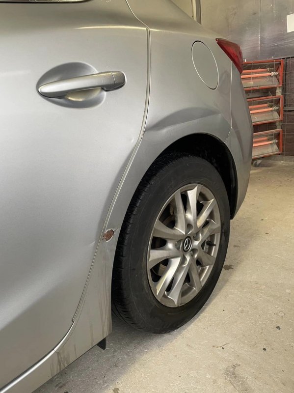 今回ご紹介させて頂くのはマツダアクセラに付いてしまったキズ・ヘコミ修理作業のご紹介になります。リアドア リアフェンダに擦り傷へこみがあります