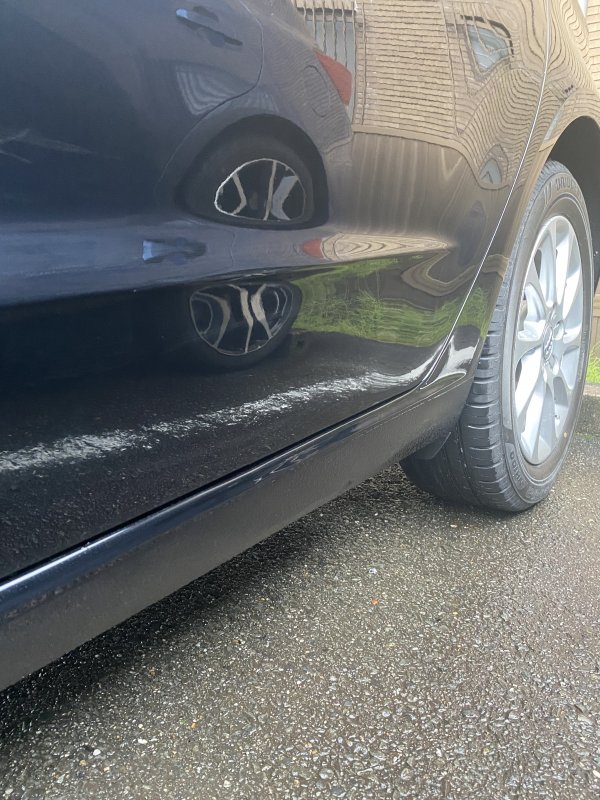 サイドステップは、2センチ程中に押されておりました。この場所の鉄板はかなり硬いので、どこを引きながらどこを叩くか考え、ゆっくりとテンションをかけながら丁寧に引き出し、輸入車専用の塗料で綺麗に塗装し、交換する事なく修理完了です☆