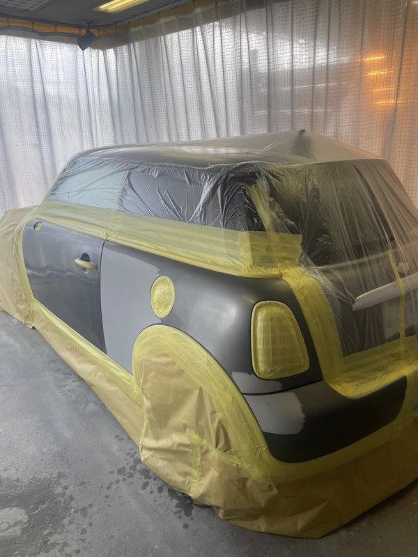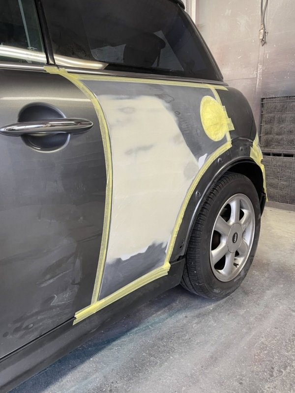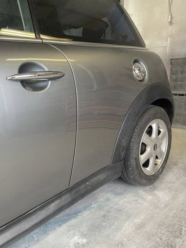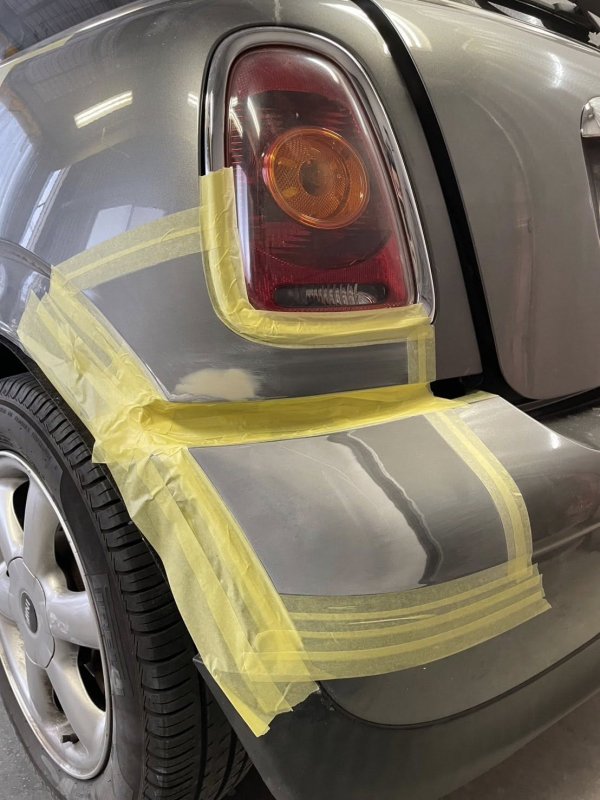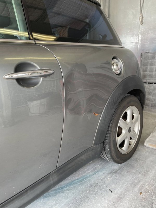 MINIのリア周り(リアフェンダ・リアバンパー)に擦り傷とへこみが発生したため、鈑金塗装修理を行いました。カラーは輸入車らしい鮮やかな色味のため、色の再現性を高める目的でフロントドアへのぼかし塗装も施工しています。