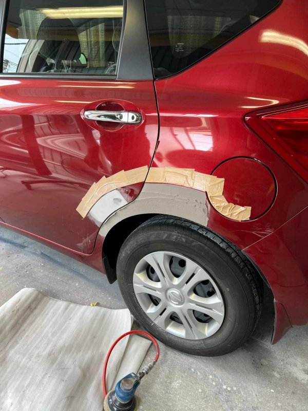 奈良県 生駒市 日産 ノート フロントバンパー キズ へこみ フレーム修正 板金 塗装 修理保証 安い 値段