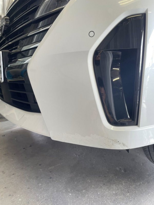 入庫時、フロント右下を縁石に接触したような擦り傷と局部的なへこみがありました。