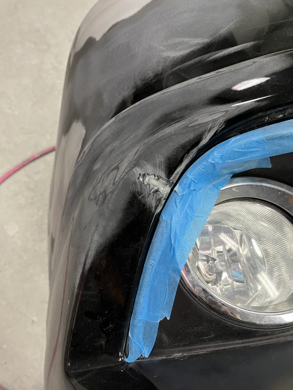 フロントバンパー修理、TRDエアロ、内板修理、フェンダー交換、ライト交換の依頼です。フェンダー、ライトは割れと折れ曲がってるので塗装交換です。エアロは製造されてなく修理になりました