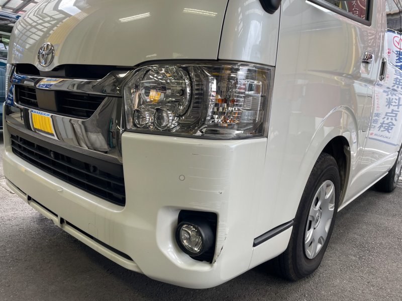 静岡県富士宮市|ハイエース(トヨタ)のキズ・へこみ直し事例(フロントバンパーのキズと変形修理、フォグカバーの交換)