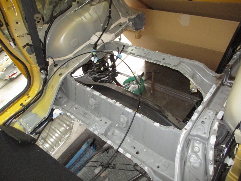 外傷だけで見ると、バックドア、リアバンパー、左クォーターのキズへこみなのですが、骨格を見ていくとリアバンパー裏のバックパネルと続くトランクフロアの部分にもへこみが出来ています。トランクフロアを支えている骨格のリアサイドメンバーに関しても、折れ曲がってしまっていました。