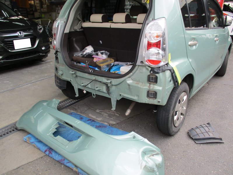 【三鷹市・武蔵野市・小金井市・府中市・調布市・杉並区・世田谷区】 パッソ リアバンパー キズへこみ修理