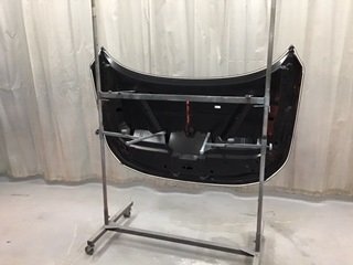 新しいボンネットが届いたら、調色したカラーで塗装しクリアを噴きかけツヤを出してから、交換取付け致しました。