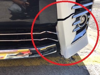 お車を確認させて頂くと、フロントバンパー左側部分が割れていつのがわかりました。それに伴い、左フェンダーが変形してしまっていました。