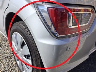お車を確認させて頂くと、バックドアの左側部分にへこみが付いており、リアバンパー左部分の接触跡とズレ及び左テールランプのキズが確認出来ました。