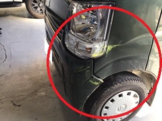 | 修理の箇所・サービス内容 | フロントバンパー/左フェンダー/左ヘッドライト キズへこみ修理 |