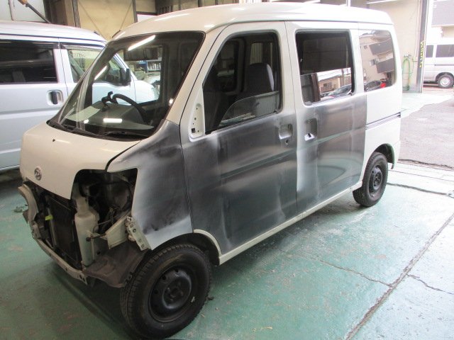 今回は「ダイハツ ハイゼット」の左フロントフェンダー、左ドア2枚 キズ・ヘコミ修理を行いました。