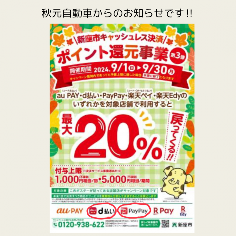 キャンペーン期間中に当社でキャッシュレス決済を利用していただくと、お支払い金額の20%がポイント還元されます。この機会に、スマートフォンを使った簡単なキャッシュレス決済を体験し、お得に車のメンテナンスをお楽しみください!