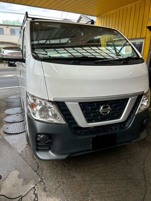 今回は、ニッサンのキャラバンの車検と鈑金を同時に行いました。