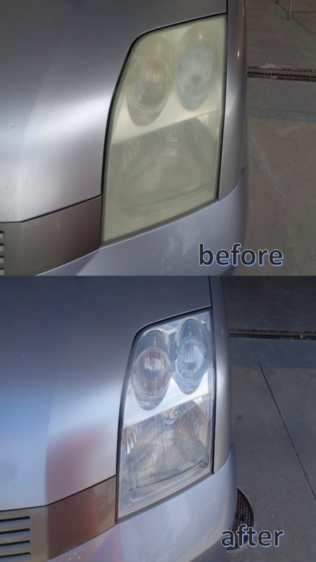 経年劣化により左右のライトの黄ばみと曇りがすごく夜間もライトが暗く見にくい上にこの状態では光量不足で車検も通らない為、作業をさせてもらいました。