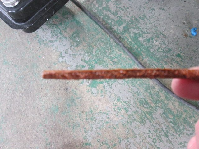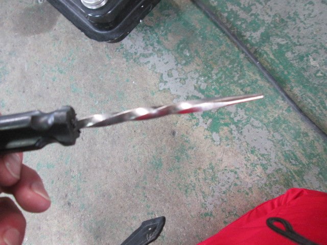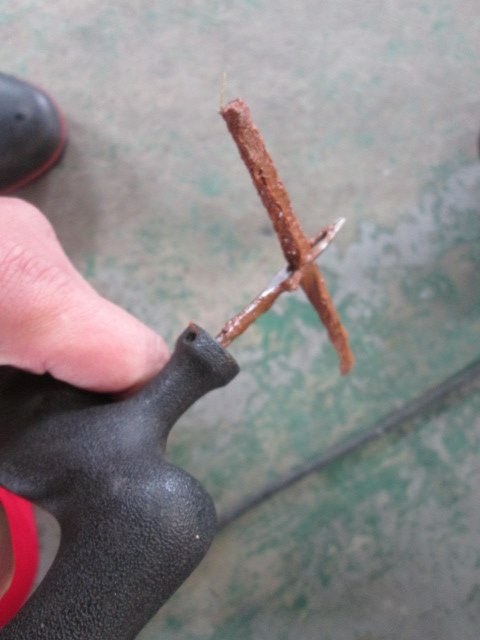 釘の刺さった所に漏れ止め材を入れる為、穴を大きくします。